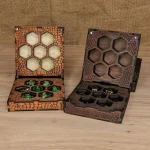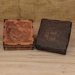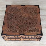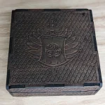 A compact, square wooden dice box with an etched dragonscale finish and your choice of Targaryen-inspired or shield lid design. Holds a standard 7-dice set. Laser-cut, hand-finished, and available light or dark stained.